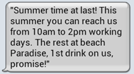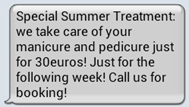Rhythms are changing during summer time. Inform your customers about the new opening hours or about the days when you will be closed for vacation, so they know when and where they can find you. A simple SMS reminder is a good incentive for a customer to return!